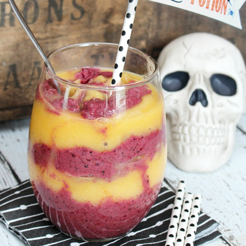 This smoothie is a fun way to incorporate fruit and vegetables like peaches, berries, spinach, and cauliflower into your kid’s diet while keeping them in the Halloween spirit.