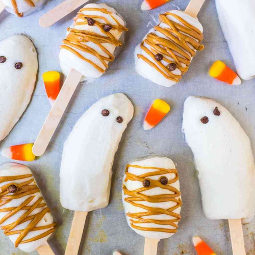 Frozen bananas coated in Greek yogurt and drizzled with peanut butter to resembled ghosts and mummies, a great way to get into the Halloween spirit!