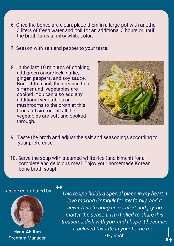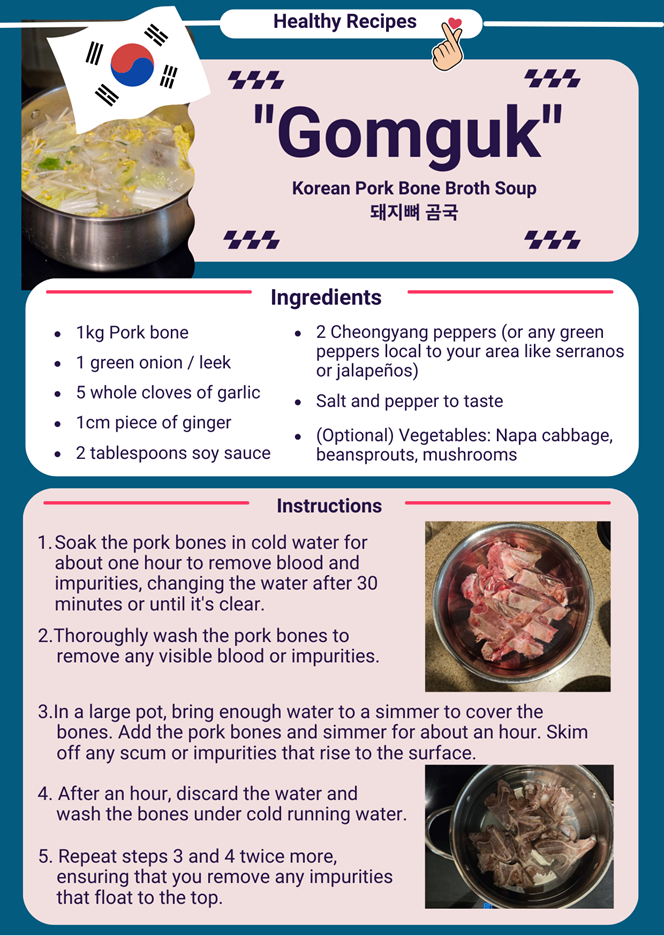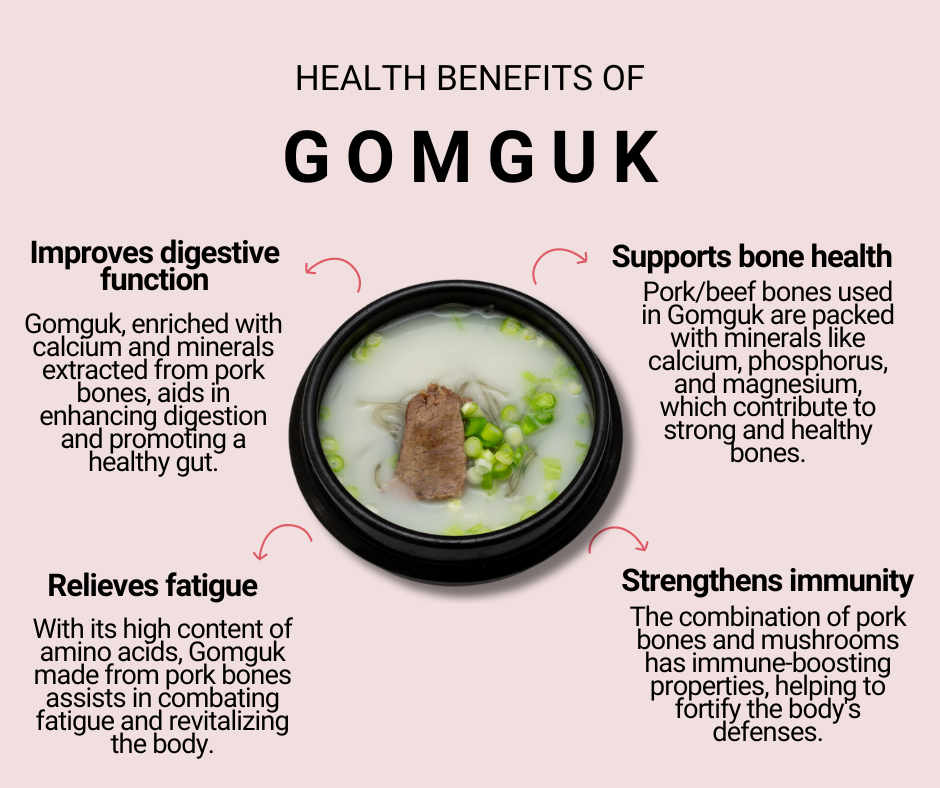 Sometimes, vegetables like napa cabbage, beansprouts, green onions and mushrooms are added which lends a delightful taste and aroma to Gomguk. This soup is typically enjoyed with rice, making it a satisfying and healthy meal option. Not only is Gomguk incredibly delicious, but it also boasts numerous other health benefits: